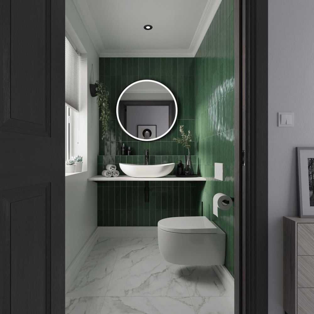 Green tiles are one of the best ways to bring colour into your bathroom. With so many designs available – from classic subway tiles to intricate mosaics – you can use them for full walls, splashbacks, or feature floors.