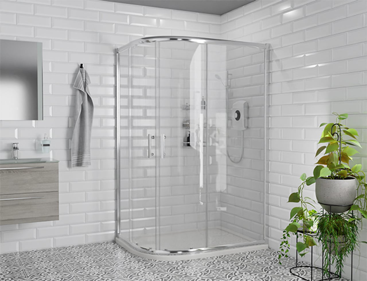 Offset quadrant enclosures typically feature sliding doors, maximising space efficiency and providing easy access.