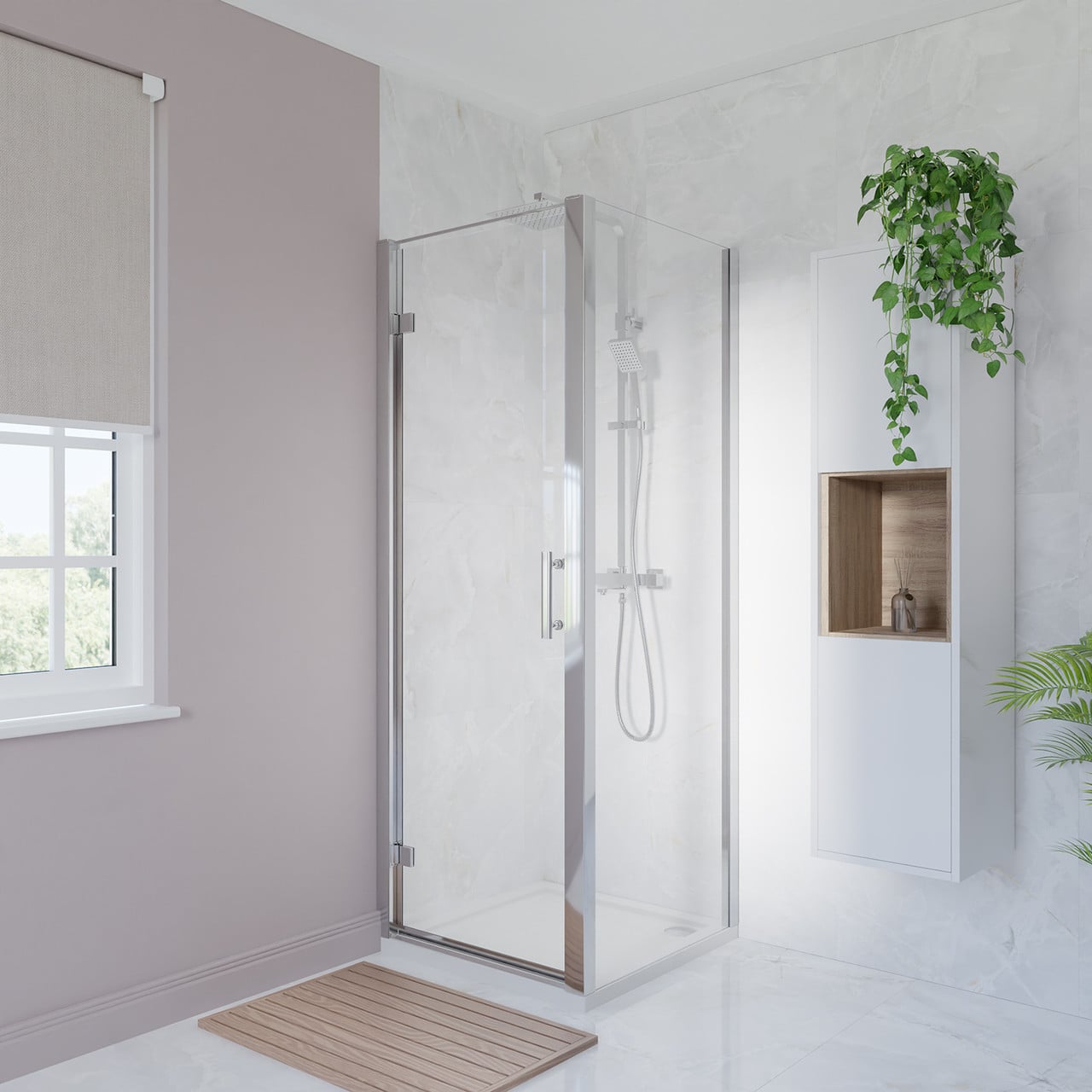 Sliding doors are great for saving space, as they don't require additional clearance to open – while pivot and hinged doors are best for larger bathrooms, as they need room to swing.